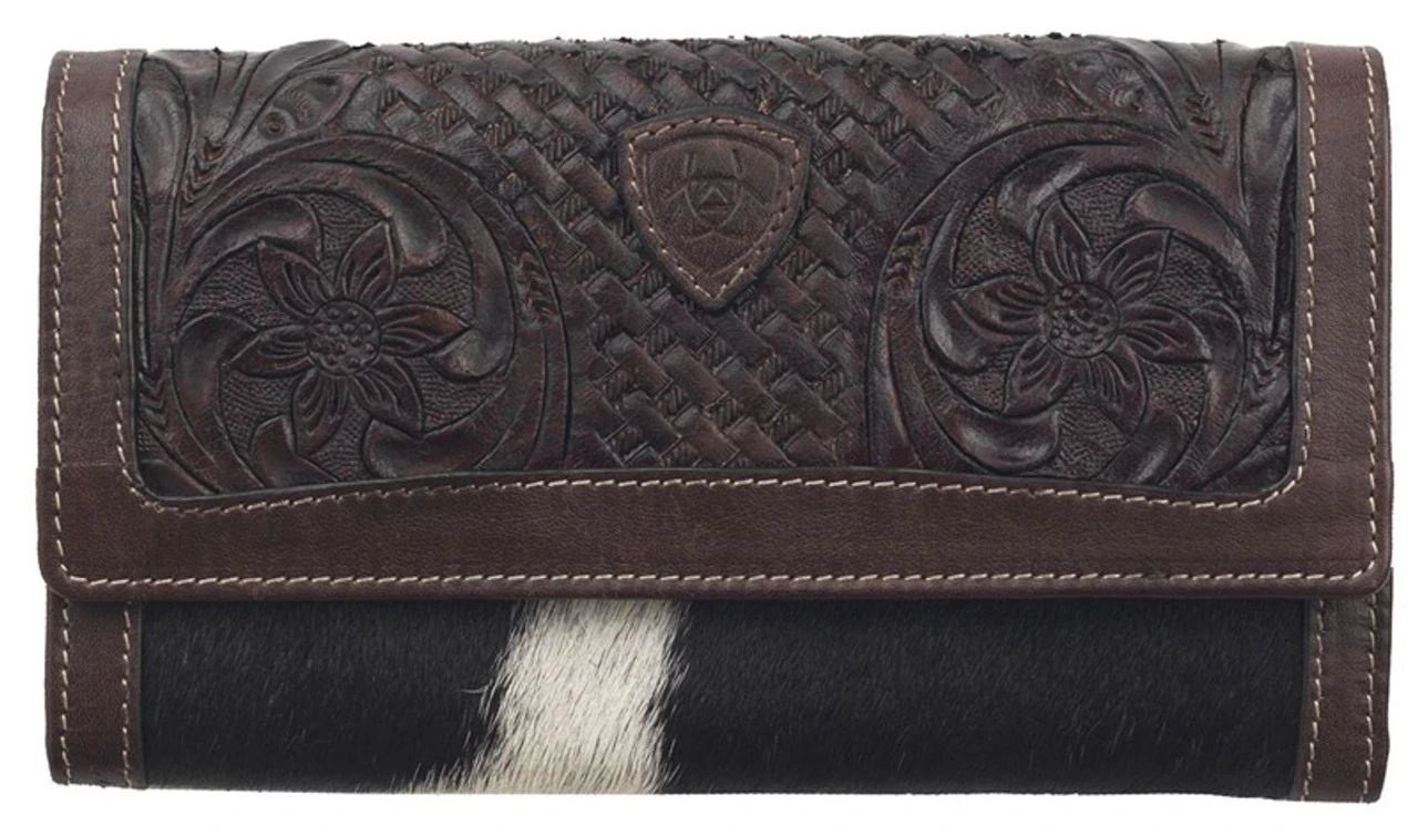 This Ariat flap over wallet by M&F Western Products is from the Alexandria collection and has a beautiful sunflower embossed front on genuine leather with calf hair center. Multiple compartments for cash and credit cards. Measures: 4 x 1 x 7-1/2.
