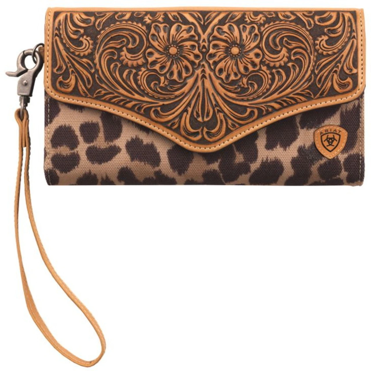 Both trendy and practical Ariat cell phone clutch wallet by M&F Western Products. Tooled genuine leather flap closure with leopard print body. Removeable wristlet strap. Measures: 7-1/2 x 1/2 x 4-1/2.