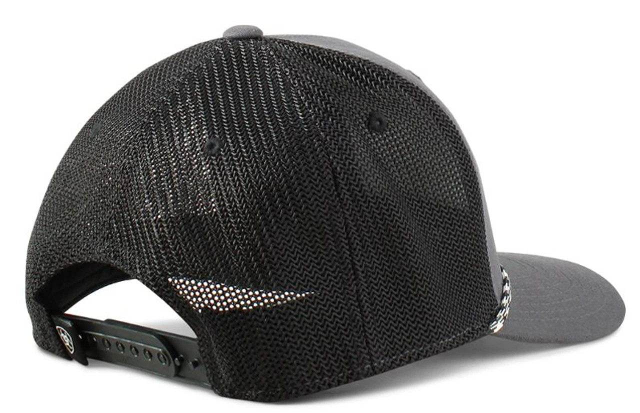Ariat menâ€s Flexfit cap by M&F Western Products. Front two panels are designed with the Ariat logo and red, white, and green Aztec design. Black and white rope accented around the bill. Black mesh back with snap back closure. Ariat Mens Flexfit 110 Cap Grey with Black Mesh Back 98% Polyester, 2% PU Spandex Snap Back Closure Structured Ariat Logo 6 Panel