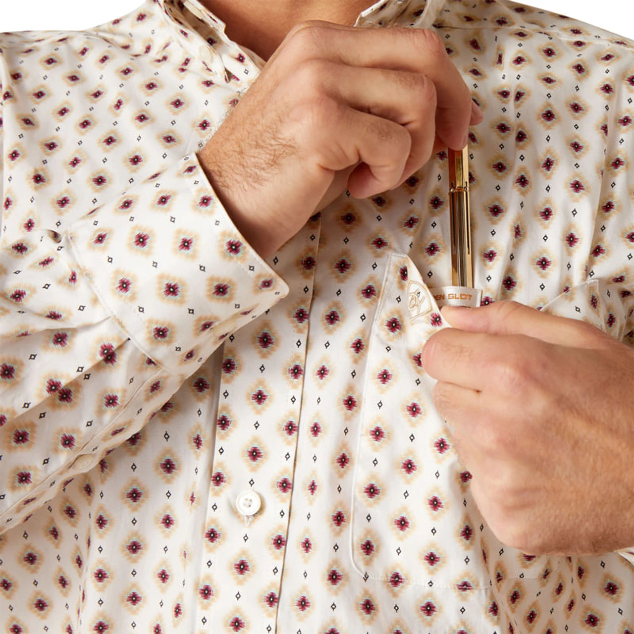 Aria Men’s Naten White Fitted Long Sleeve Button Up Shirt is a classic button down woven placket label long sleeve offered in printed poplin. White with coral all over diamond print Adjustable button long sleeve Woven placket label Classic button down Spread collar 100% cotton Imported