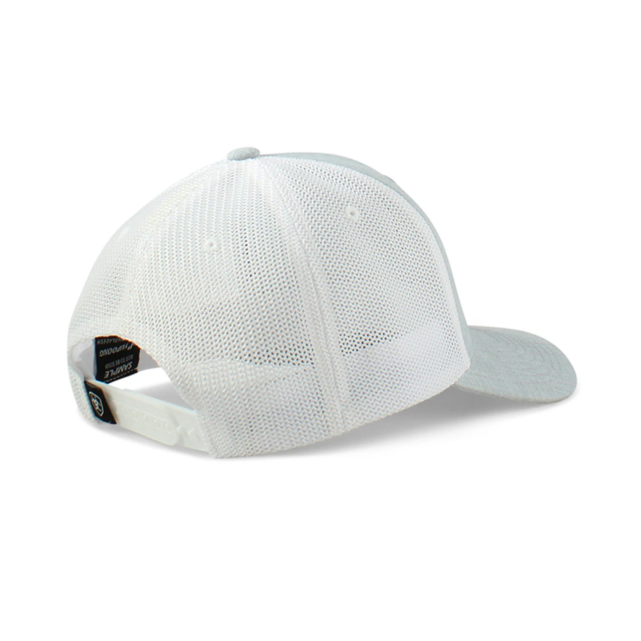 Ariat menâ€s Flexfit cap by M&F Western Products. Rubber patch with blue embossed Ariat name and logo over blue-grey fabric with a blue-grey bill. White mesh back with snap back closure. Ariat Mens Flexfit 110 Cap Blue-Grey Cap with White Mesh Back Ariat Logo Snap Back Closure 6 Panel High Profile Structured 96% Polyester, 4% Polyurethane (PU)