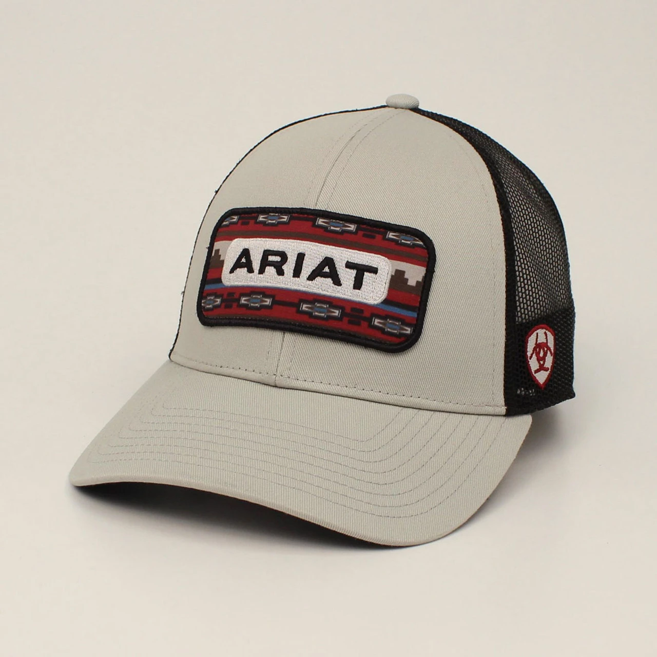 Comfortable Ariat menâ€s cap by M&F Western Products. B fit style in grey front panels and bill. Ariat logo embroidered on rectangle patch with southwestern pattern. Black mesh back panels with snapback closure for a perfect fit.