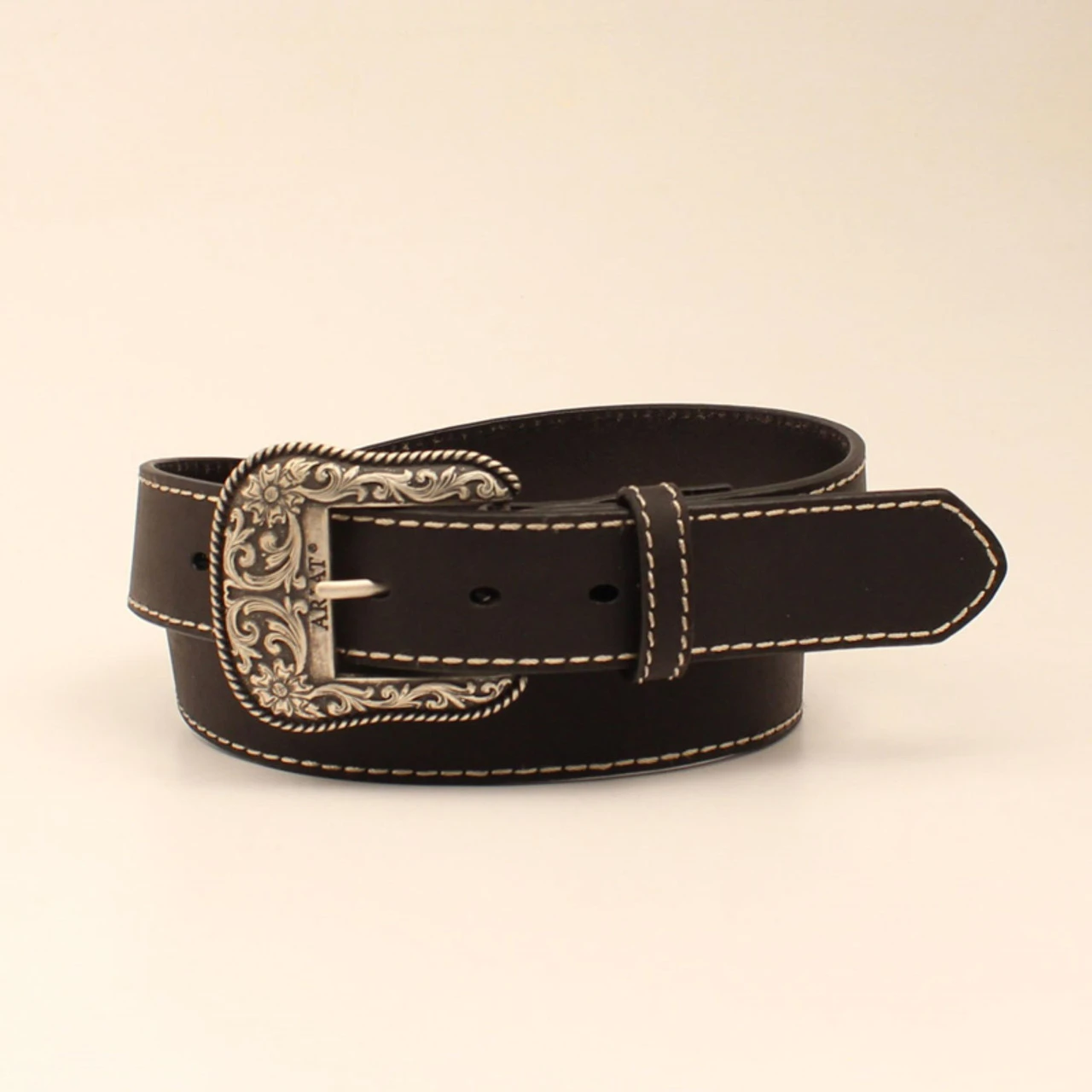 Fashionable Ariat ladies belt by M&F Western Products features a classic leather strap with heavy stitched edges and a beautiful Ariat buckle. Available in sizes Small through X-Large.