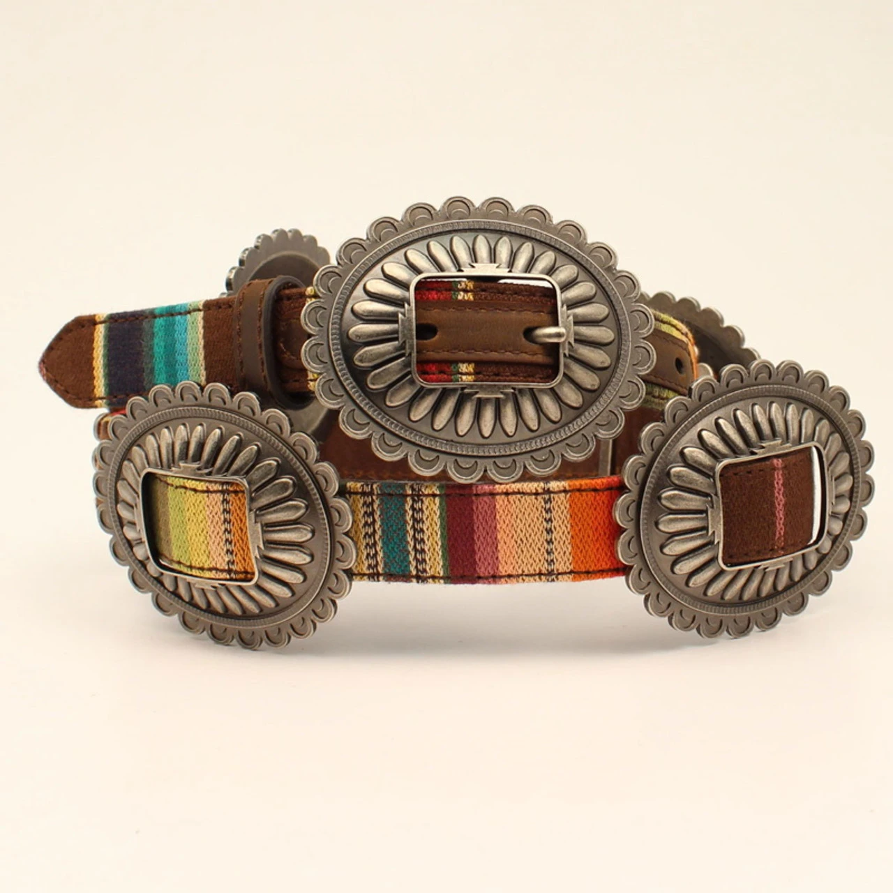 This ladies Ariat belt by M&F Western Products has a stylish western look. The multi colored fabric serape strap is 1â wide. It is accented with large oval floral silver conchos. This belt would look great with your favorite oversized shirt. *** Ariat belts are measured from the end of the strap on the buckle side to the center of the middle hole. The best rule of thumb is to buy a belt 2â larger than your waist/pant size. Small: 30â Medium: 34â Large: 38â XLarge: 42â